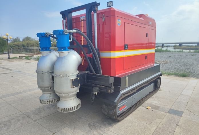 前端設(shè)計(jì)為雙吸水口,并配備遙控升降式結(jié)構(gòu),使其能在僅380毫米深的淺水區(qū)域高效作業(yè)。兩側(cè)裝有液壓驅(qū)動(dòng)系統(tǒng),底部則為履帶式行走裝置,確保在泥濘地面行走時(shí)不會(huì)對(duì)路面造成損害。